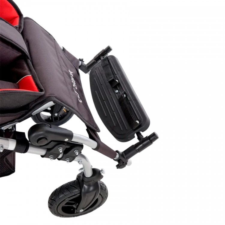 Цельная подножка коляски настраивается по длине и оснащена фиксирующими ремнями для стоп и ремнем-упором для поддержки голеней.