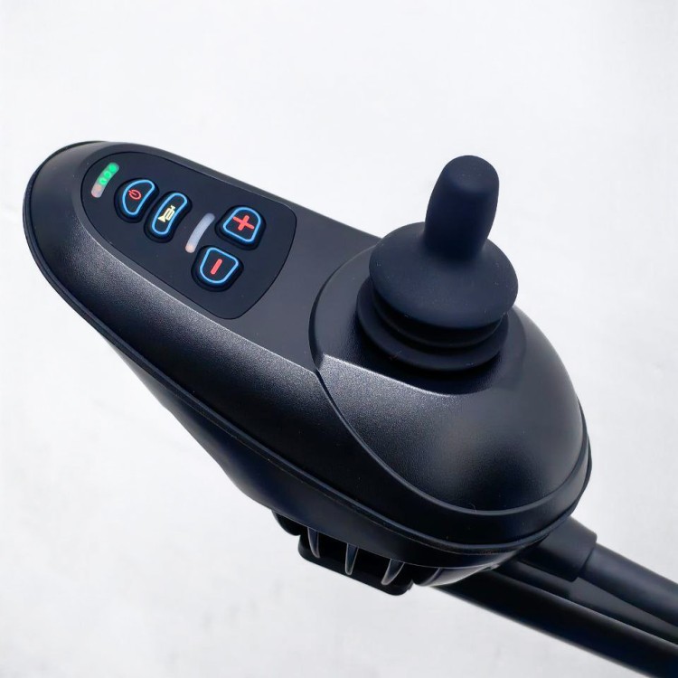 Перемещение коляски осуществляется с помощью джойстика, а также может осуществляться сопровождающим лицом.