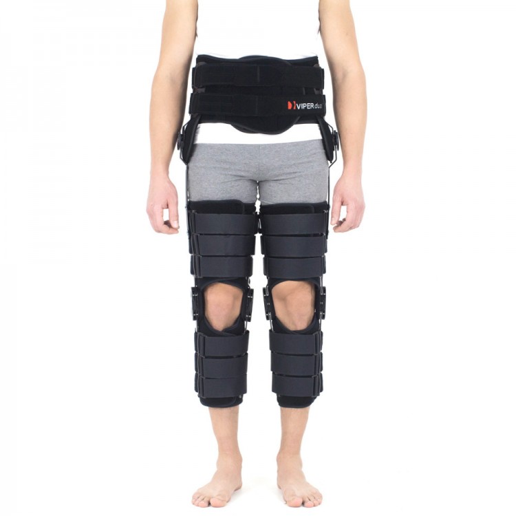Состоит из мягкого широкого тазобедренного пояса, мягких рукавов бедра и голени, пластиковых обойм и боковых ортопедических шин.