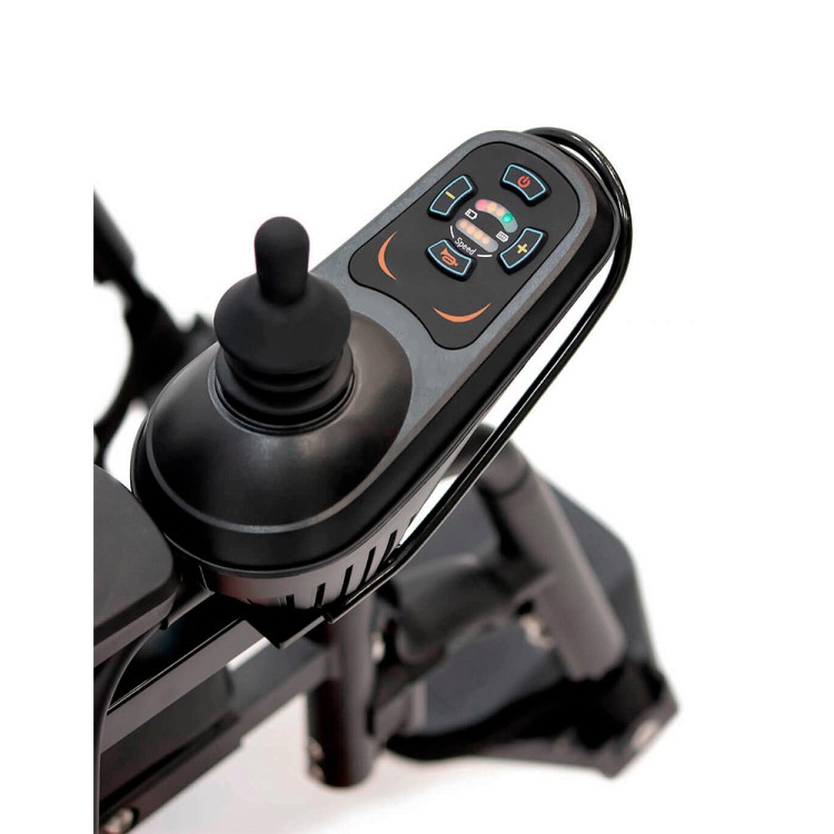 Коляской можно управлять как с помощью эргономичного джойстика, расположенного на подлокотнике, так и с помощью пульта дистанционного управления для сопровождающего.