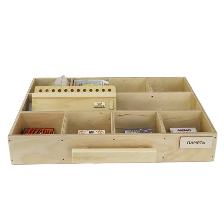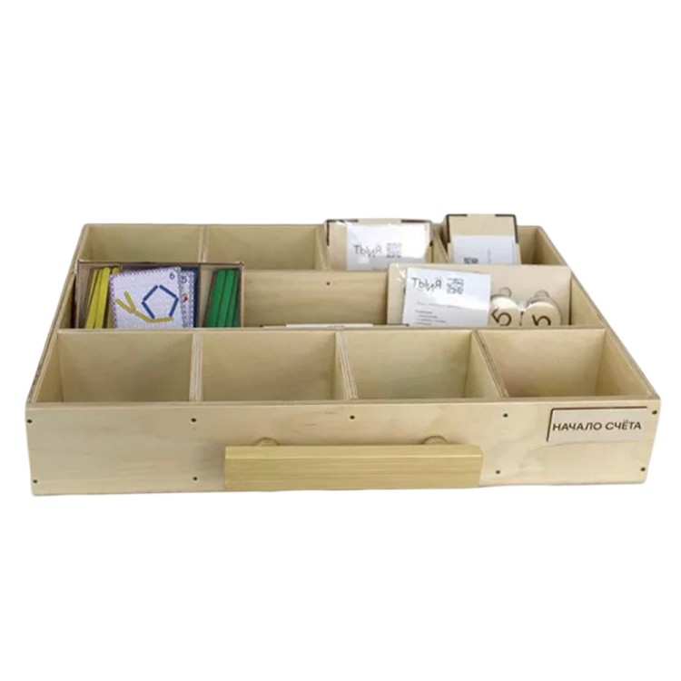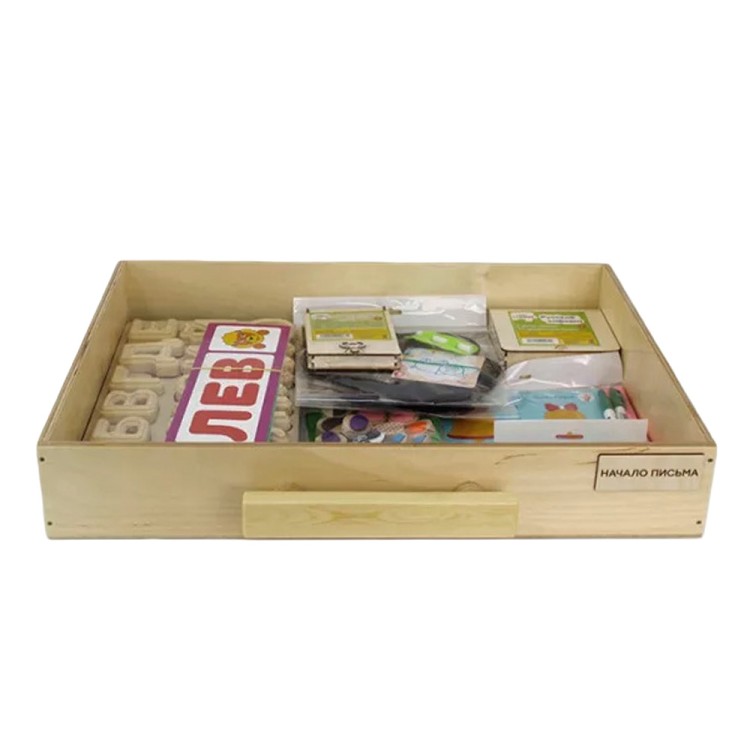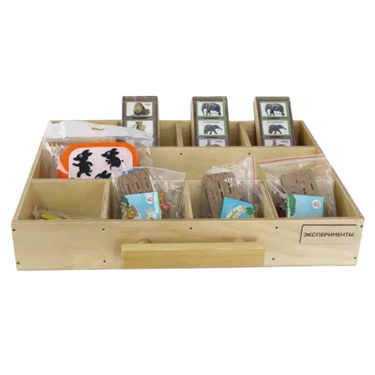 Комплект поставки включает в себя комод из натурального дерева, 7 обучающих модулей, методическое пособие и дополнительный набор «Сенсорный ящик» в подарок.