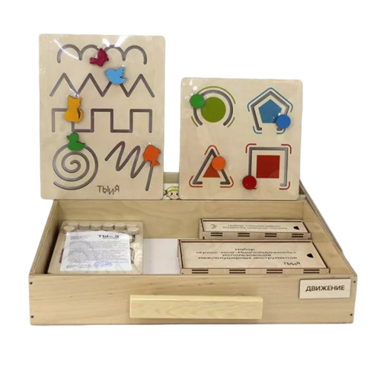 - Набор межполушарного развития «Кросс-мозг. Многозадачность» (БВ-029) – укрепляет взаимосвязи между полушариями головного мозга, включает игровые элементы и упражнения для развития когнитивных функций и мозжечкового взаимодействия (9 тематических комплектов).