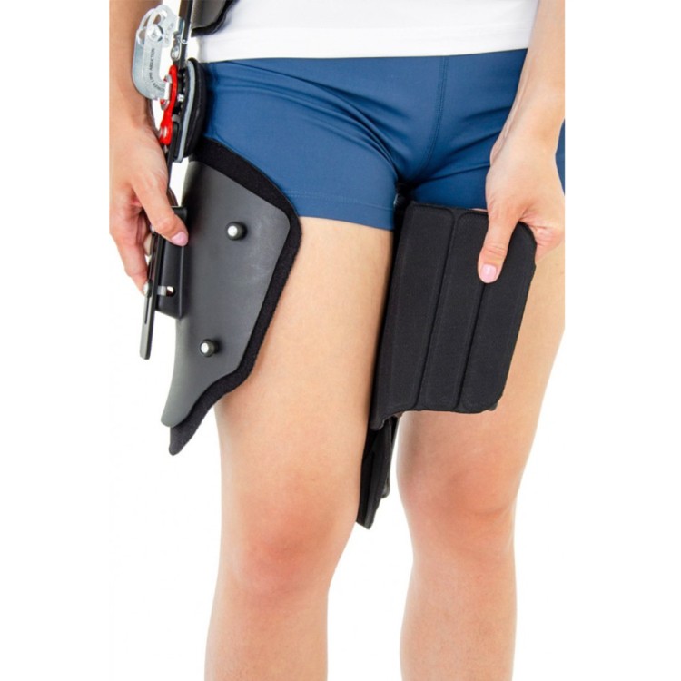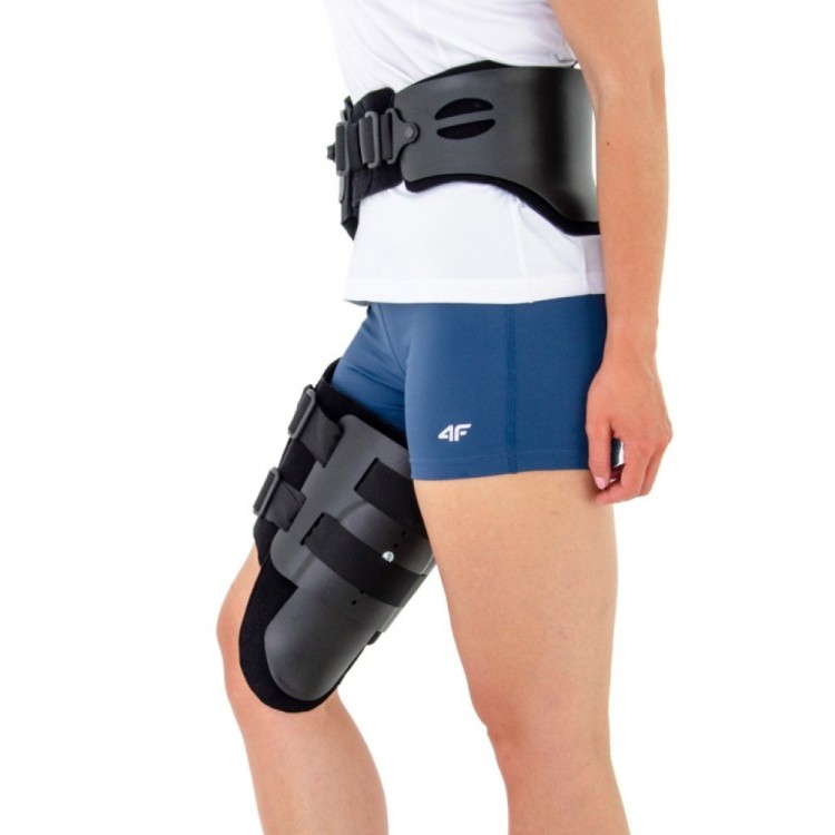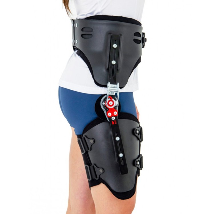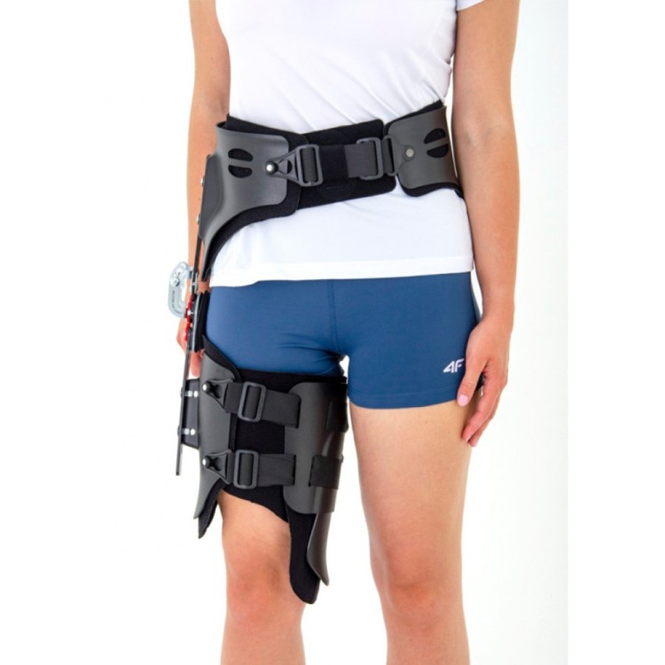Ортез состоит из пояса с креплением на бедрах, манжеты с креплением на ноге и боковой шины с регулировкой угла сгибания и опцией отвода конечности.