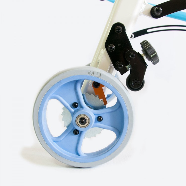Передние колеса оснащены фиксатором направления движения. Задние колеса регулируются по степени прилагаемого усилия, оснащены храповым механизмом.
